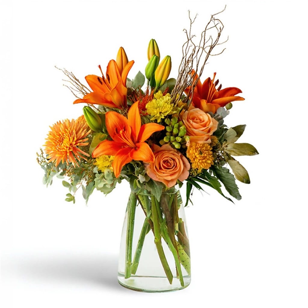 Overflowing with autumn energy, this arrangement captures the cozy glow of a crisp November day.
