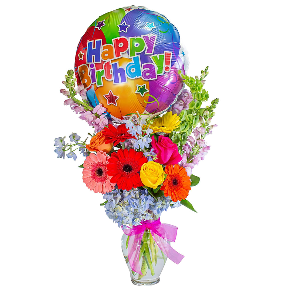 What's all the fuss about? You! Birthday Hoopla is perfect to say "Let's Celebrate You today". Colorful Gerbera Daisies and Roses are bright and cheery in this fun arrangement.