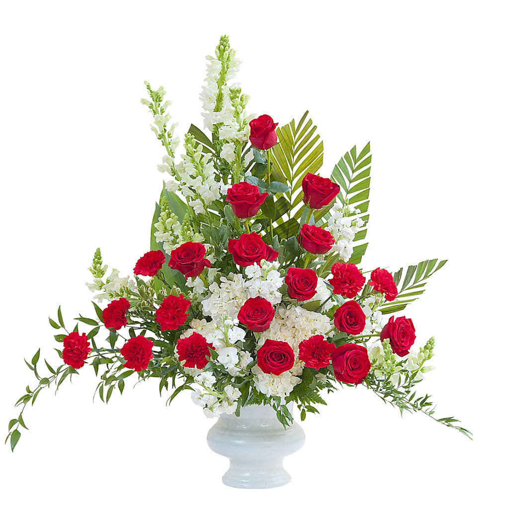 Red and white premium varieties of flowers combine with lush foliage in this beautiful urn.