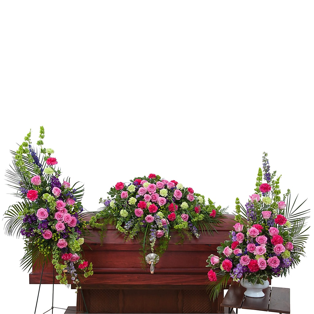 Forever Cherished Trio includes a casket spray, standing easel spray and crescent urn arrangement. As Shown (Deluxe)