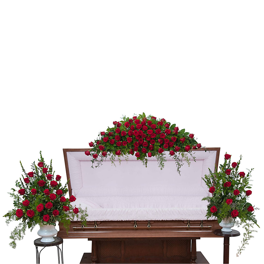 This elegant collection includes a casket spray with matching urns. As Shown (Deluxe)